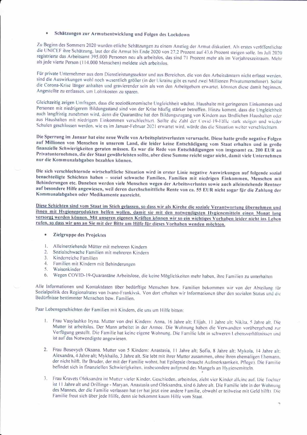 Anbei sende ich Ihnen eine schriftliche Bitte sowie paar Fotos der Verteilung von Lebensmitteln, die wir in der letzten Zeit durchgeführt haben.